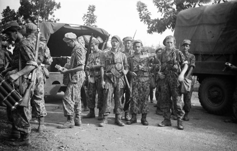 Aan het einde van 1945 werd door de Nederlandse regering een grote hoeveelheid militair materiaal uit de Amerikaanse dump op Biak (Nieuw Guinea) gekocht. Behalve allerlei wapens, voertuigen en andere uitrusting zat daar ook een grote hoeveelheid 'M1942 Jungle Camouflage Coveralls' bij. Deze 'Jungle Suits' zijn in 1942 speciaal ontwikkeld door het Amerikaanse leger voor gevechten in de jungle en gemaakt van gecamoufleerd HBT (Herring Bone Twill; visgraatstof) katoen, maar bleken te zwaar, oncomfortabel en onpraktisch te zijn. Na een half jaar gebruik werden de meeste coveralls weer ingenomen en opgeslagen op Biak.